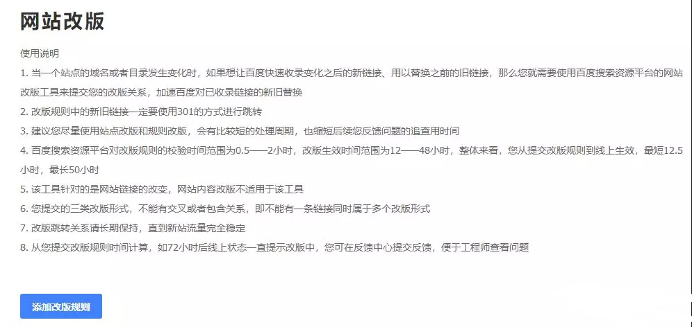 網(wǎng)站的鏈接改版首要用到的東西是百度站長渠道的網(wǎng)站改版東西,詳細細節(jié)闡明如下圖: