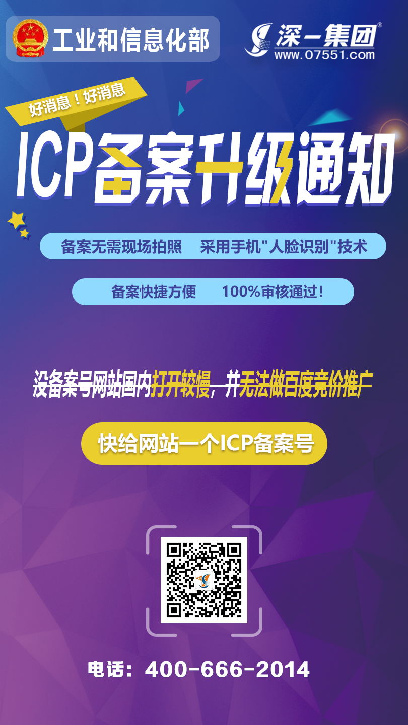 [深一ICP備案]好消息!ICP網(wǎng)站備案升級(jí)啦!備案無需現(xiàn)場(chǎng)拍照,直接采用手機(jī)"人臉識(shí)別"技術(shù);備案快捷方便,100%審核通過;沒備案號(hào)網(wǎng)站國內(nèi)打開較慢,并無法做百度競(jìng)價(jià)推廣。詳細(xì)備案咨詢深一商務(wù)!